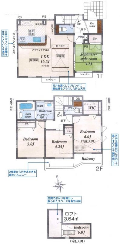 LDK16畳(1F)、和4.5畳(1F)、洋5畳(2F)、洋4.25畳(2F)、洋6畳(2F) |